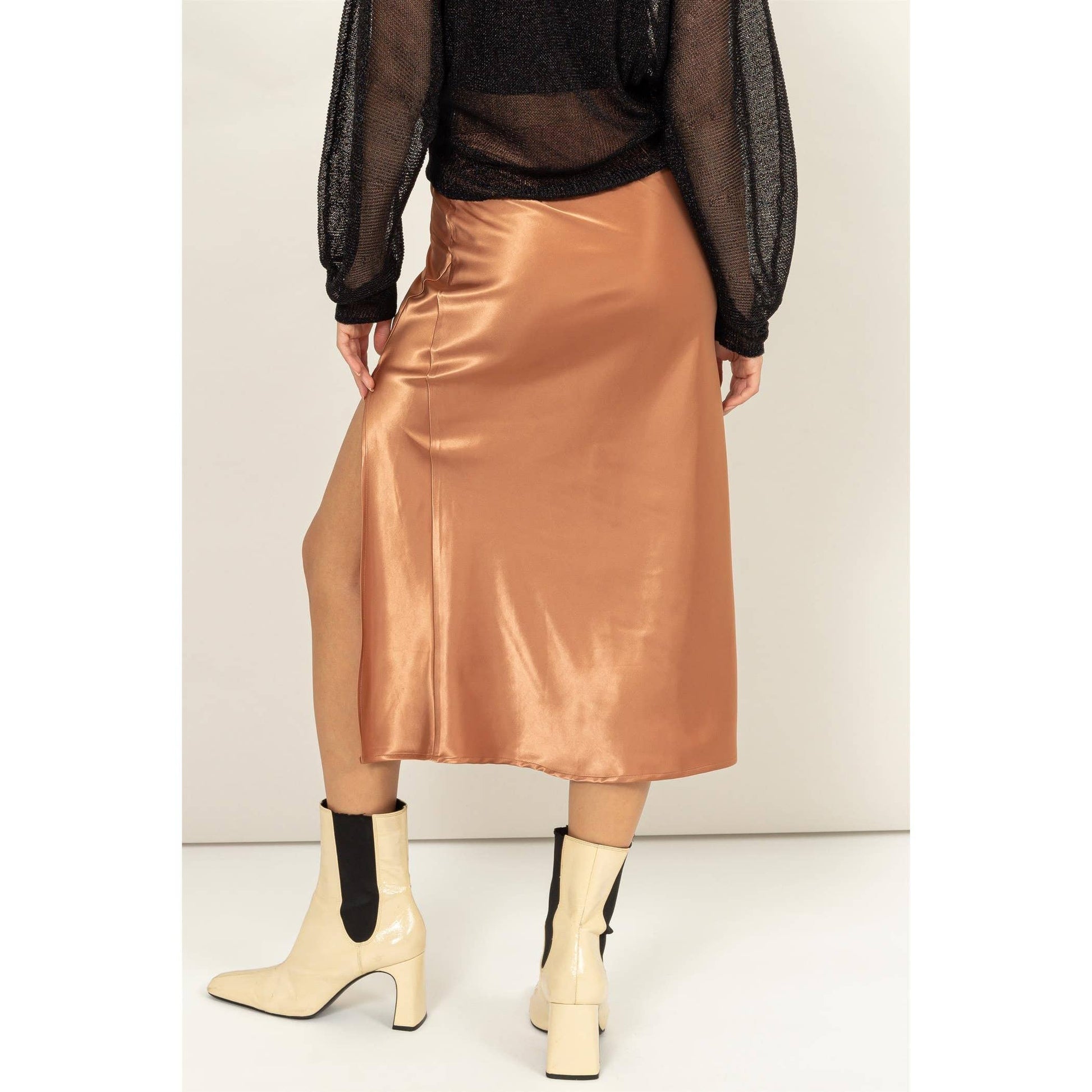 THIS SATIN MIDI SKIRT FEATURES A SIDE SLIT AND HIGH WAIST FOR A SLEEK AND ELEGANT LOOK. THE SMOOTH SATIN FABRIC DRAPES BEAUTIFULLY, MAKING IT PERFECT FOR BOTH DAY AND NIGHT. PAIR IT WITH A FITTED TOP OR BLOUSE AND HEELS FOR A POLISHED ENSEMBLE.