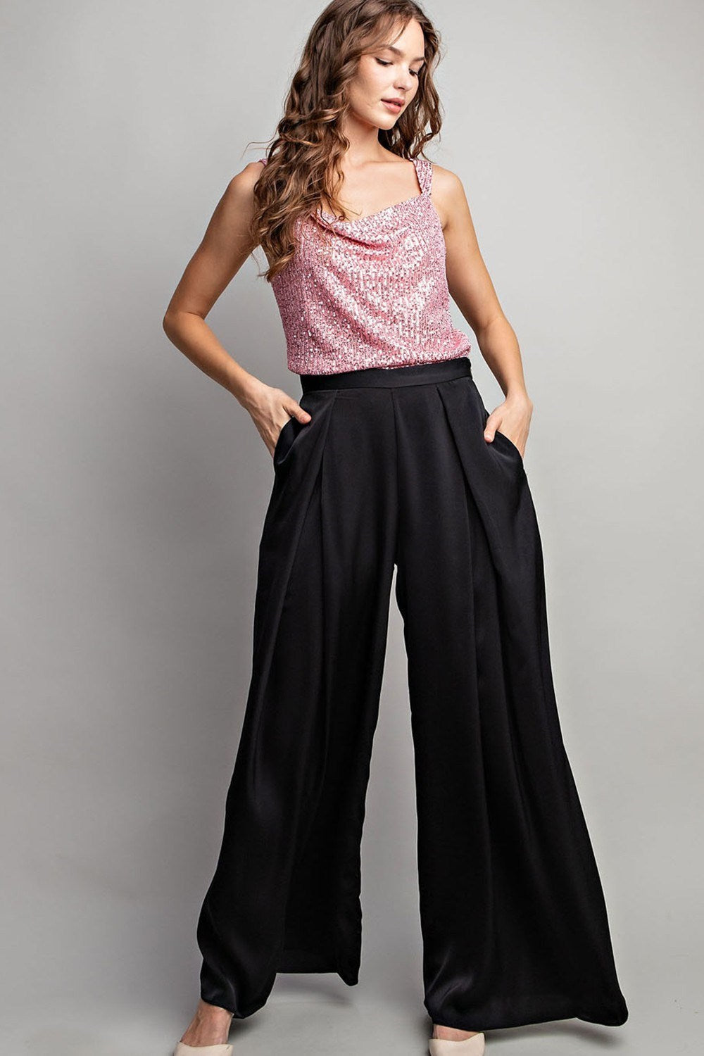 Extreme wide leg pants made in a high waisted fit in a satin fabric. Detailed with a pleated front look.
