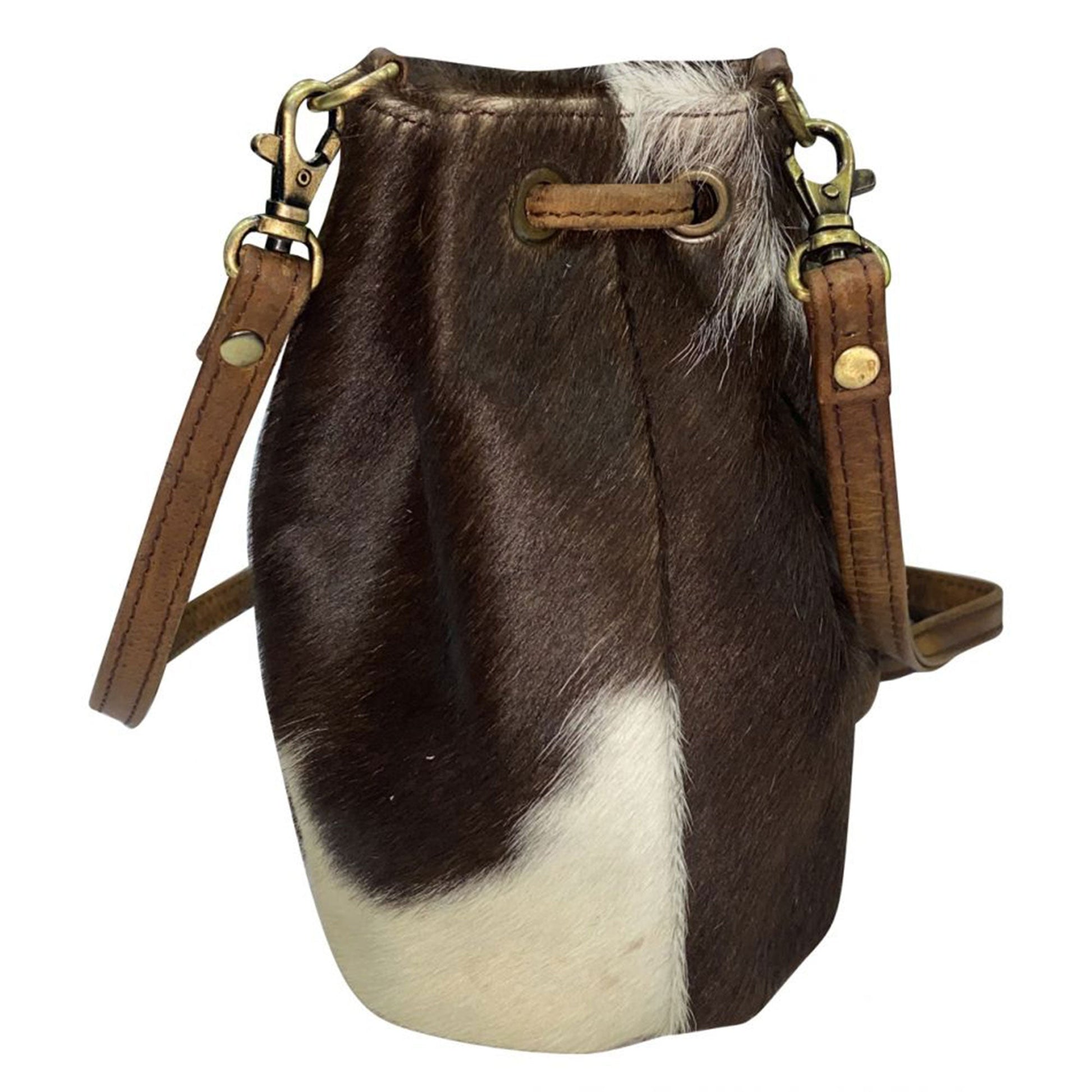 Showman ® Small Hair on Cowhide Leather Bucket Bag. This bucket style hair on cowhide bag features a leather drawstring closure, inside pocket and a removable adjustable strap. Measures Approx. 12" H x 12.5" W,