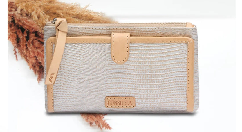 Our Slim Wallet carries cards and cash without weighing you down. Open the snap closure to reveal an ID window pocket, 12 card slots, and 4 slide pocket compartments in this versatile wallet.