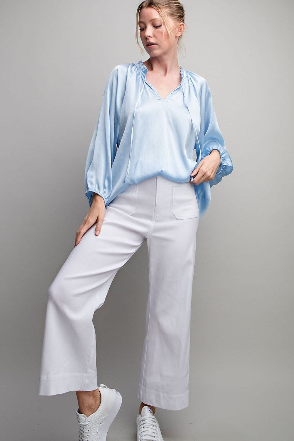 V-neck long sleeve satin top with an optional tie front. Cute and flowy top that can be worn everyday!