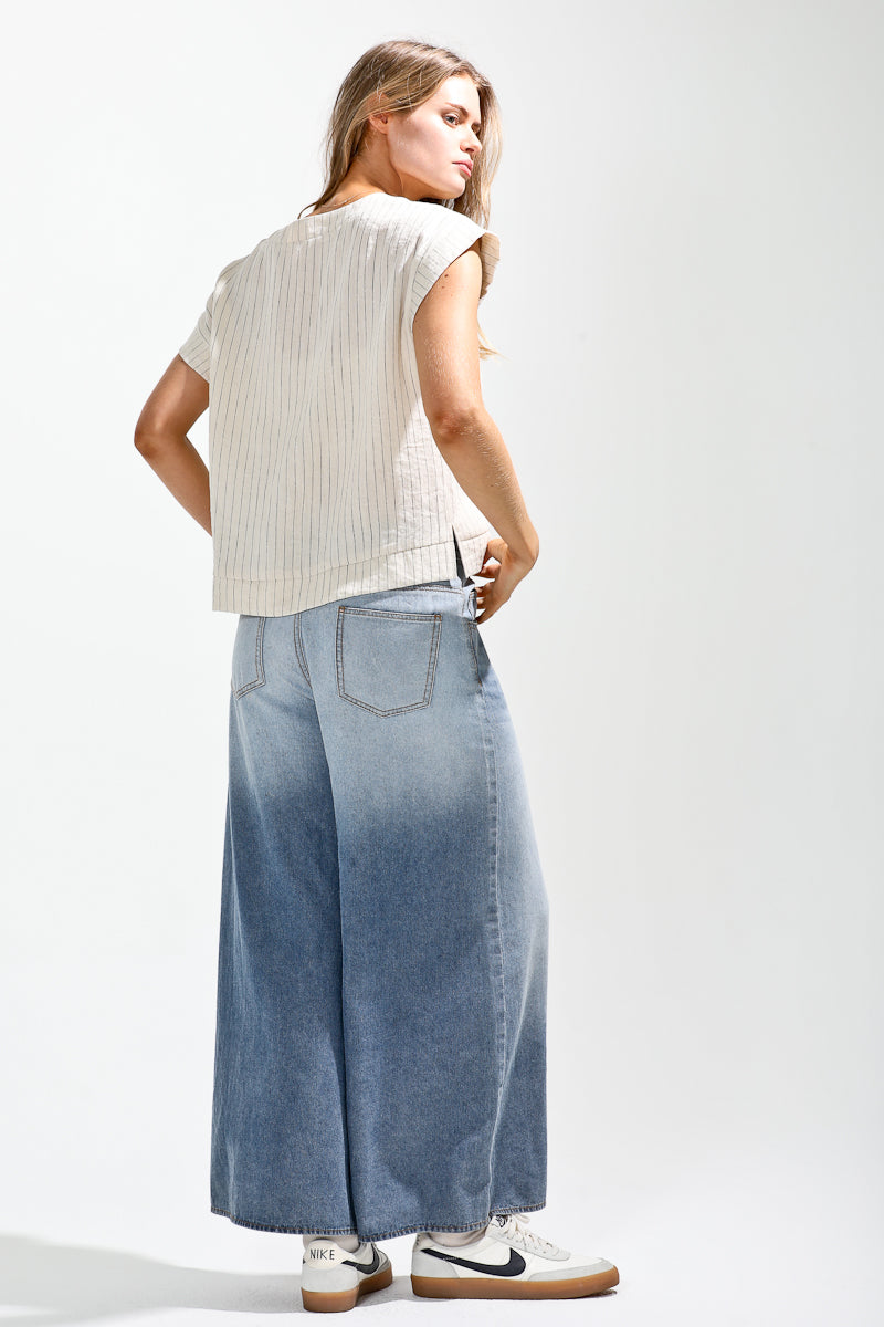 Waist strap included ombre dyed wide denim pants - Light Denim